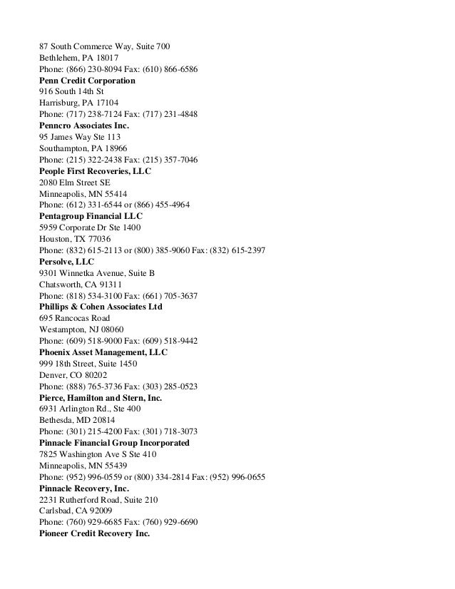 Collection Agency Central Credit Control Penn Credit Corp II 916 South 14th Street Part Kyle Donagher 2 Latchgate Lane, Mechanicsburg, PA 17050 Melanie Foley 55 Rich Valley Road, Mechanicsburg, PA 17050 Richard Templin Donald Donagher CEO Penn Credit ... Return Document
